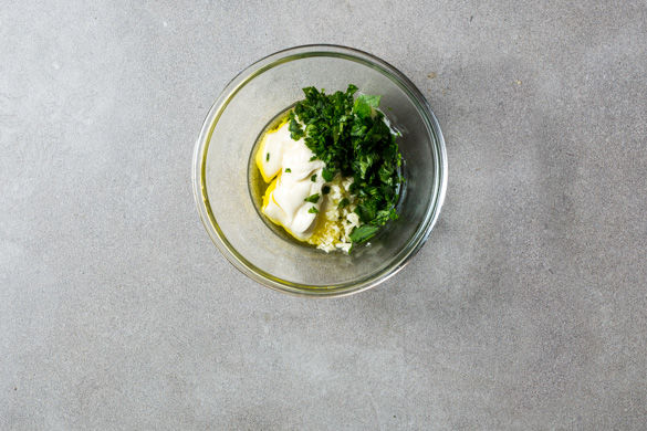 Inzwischen die Petersilie samt Stängeln fein hacken. Den Knoblauch schälen und fein würfeln. Ca. 1/3 der Petersilie und den Knoblauch mit dem Joghurt und der Mayonnaise verrühren und mit 1EL Olivenöl sowie Salz und Pfeffer abschmecken. Tipp: Lieber etwas weniger Salz verwenden und später nachwürzen! Die Kartoffeln sind bereits salzig.