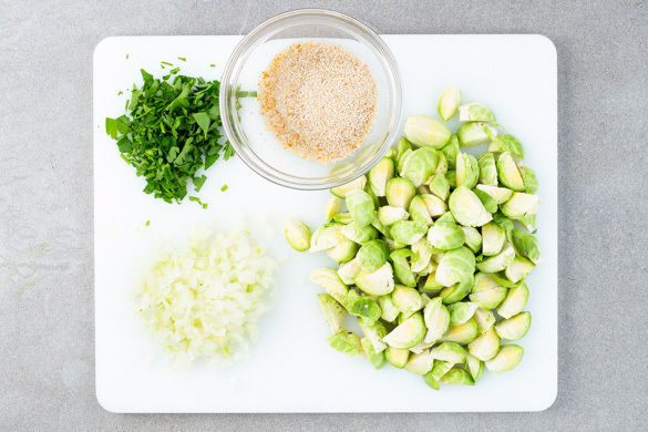 Die ½ der Semmelbrösel in 3EL Wasser einweichen. Den Rosenkohl vierteln. Die Zwiebel schälen, halbieren und in feine Würfel schneiden. Die Petersilie samt Stängeln fein hacken.