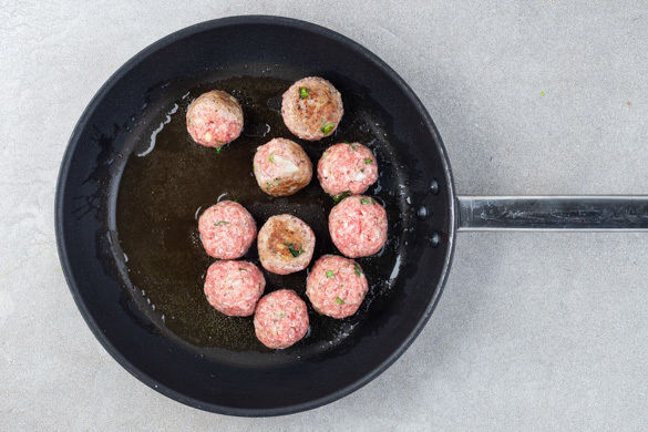 Das Hackfleisch mit den eingeweichten Semmelbröseln, der ½ der Zwiebeln, der ½ der Petersilie sowie je 1 Prise Salz und Pfeffer gründlich verkneten. Ca. 10 gleich große Hackbällchen formen und diese in einer mittelgroßen Pfanne mit 1EL Olivenöl bei mittlerer Hitze 4–5Min. rundum anbraten. Auf einem Teller beiseitestellen.