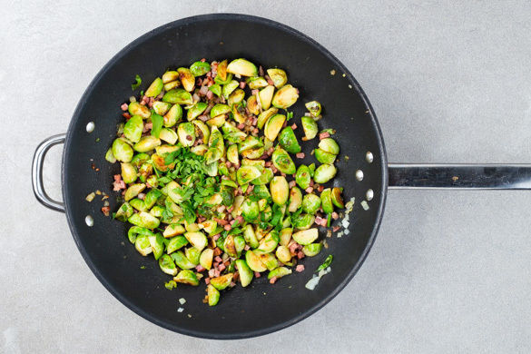 Den Rosenkohl in einer mittelgroßen Pfanne mit 1EL Olivenöl bei mittlerer bis starker Hitze 2–3Min. anbraten. Dann 3–4EL Wasser dazugeben und den Rosenkohl abgedeckt 5–6Min. bei mittlerer Hitze garen. Die ½ des Specks und die restlichen Zwiebeln unterrühren und 2Min. ohne Deckel mitbraten. Die restliche Petersilie unterrühren und mit Salz und Pfeffer abschmecken.