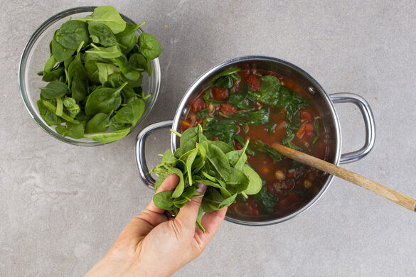 Wenn Kreuzkümmel zart duftet und die aromatische Hackfleischsuppe mit Tomaten und Kichererbsen vor sich hin köchelt, läuft dir das Wasser schon im Munde zusammen. Nur gut, dass es heute nicht lange dauert. Noch ein bisschen Babyspinat in die Suppe und das Baguette aufknuspern, schon ist das Essen fertig!