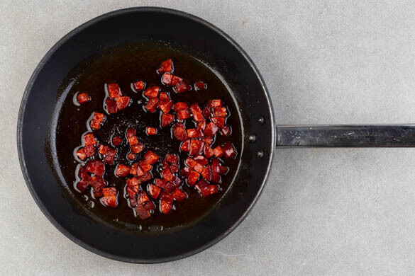 3 vegane Chorizos grob würfeln und in einer mittelgroßen Pfanne mit 1TL Olivenöl bei mittlerer Hitze in 4–5Min. knusprig braten, dabei gelegentlich umrühren. Tipp: Wer mag, kann auch mehr vegane Chorizo verwenden. Anschließend mit einer Schaumkelle aus der Pfanne nehmen und beiseitestellen. Die Pfanne nicht auswischen.
