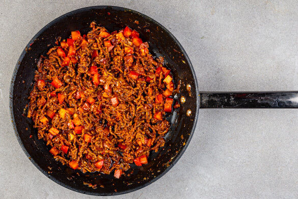 Das Hackfleisch, die Tomaten und die ½ des Tomatenmarks in die Pfanne geben und ca. 4Min. braten, bis das Hackfleisch goldbraun ist. Das Curry mit den restlichen 75ml Wasser aus dem Wasserkocher ablöschen, zum Kochen bringen und bei niedriger Hitze 3–4Min. einköcheln lassen, bis die meiste Flüssigkeit verdampft ist.