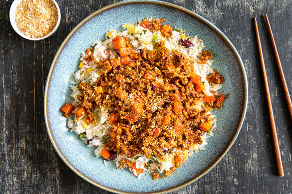 Heute kommt Leben in die Bude, denn unser Curry ist nicht nur an Farbenfreude, sondern auch an duftender Würze kaum zu übertreffen! Den Reis kochen wir ganz zwanglos in einem Topf mit grünen und roten Bohnen, Paprika und Lauch. Auf diesem bunten Ensemble präsentiert sich das Hackfleischcurry, das in wohlklingenden Gewürzen wie Kardamom, Kurkuma und Zimt schmurgeln durfte. Geröstete Kokosraspel dazu – so schmeckt Lebensfreude!
