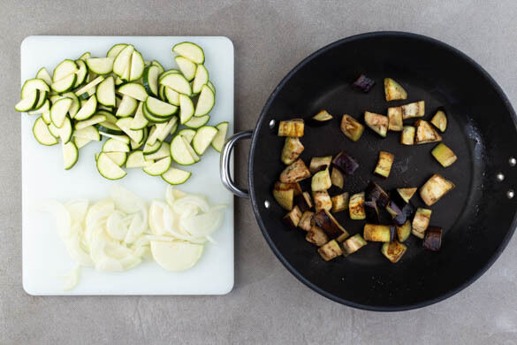 Die Aubergine in 2–3cm große Würfel schneiden und mit ½TL Salz in einer großen Pfanne mit 2EL Olivenöl bei mittlerer Hitze 6–10Min. braten, bis sie weich wird. Die Zucchini längs halbieren und in dünne Scheiben schneiden. Die Zwiebel schälen, halbieren und in feine Streifen schneiden.