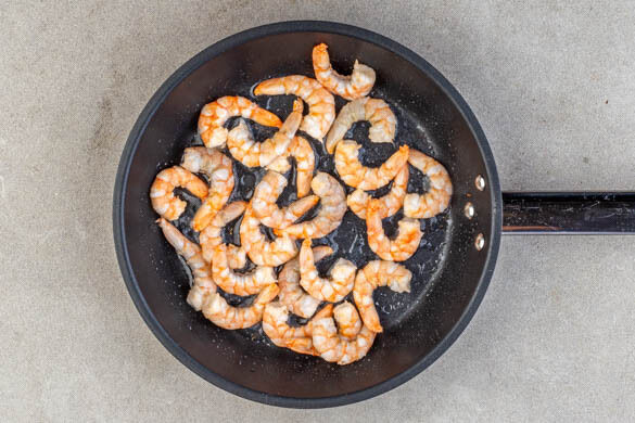 Die Garnelen in einem Sieb mit kaltem Wasser abspülen, dann trocken tupfen. In einer mittelgroßen Pfanne mit 1EL Pflanzenöl bei mittlerer Hitze ca. 2Min. anbraten.