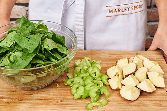 Den Spinat ggf. verlesen und grob schneiden. Den Sellerie in ca. 1cm breite Scheiben schneiden. Den Apfel vierteln, entkernen und in ca. 2cm große Würfel schneiden.