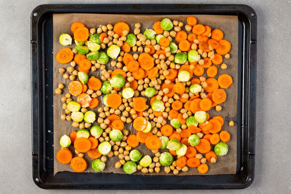Die Karotten, den Rosenkohl und die Kichererbsen auf einem mit Backpapier ausgelegten Backblech verteilen und mit 1EL Olivenöl, der ½ der Gewürzmischung und je 1 kräftigen Prise Salz und Pfeffer vermengen.