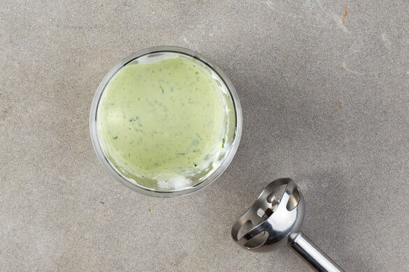 Den Schnittlauch grob schneiden. Den gebackenen Knoblauch aus der Haut drücken (Vorsicht, heiß!). Die Crème fraîche mit dem Schnittlauch, dem Knoblauch, 1EL Senf und je 1 kräftigen Prise Salz und Pfeffer in einem hohen Gefäß mit einem Stabmixer grob pürieren. Das Fleisch auf dem Gemüse anrichten und mit der Sauce beträufelt servieren.