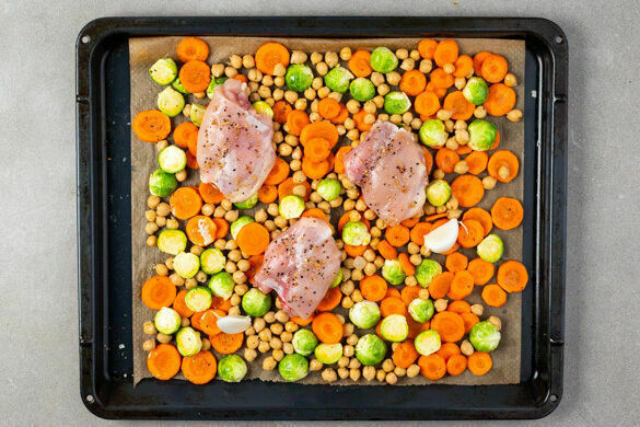 Heute darf mal wieder der Ofen die meiste Arbeit leisten! Unsere kräftig-aromatischen Hähnchenschenkel – hier in der doppelten Portion – werden lecker gewürzt und dann einer Wärmekur unterzogen. Mit auf dem Blech: eine bunte Runde runder bzw. rund gemachter Gemüsesorten. Und nachdem alle gemütlich vor sich hin geschmurgelt haben, treffen sie auf ein cremiges Sößchen mit frischem Schnittlauch. Voilà!