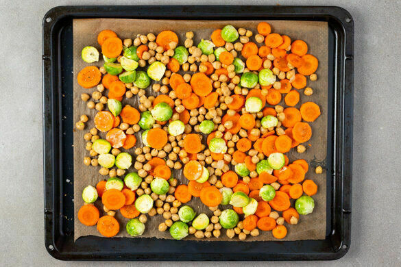 Die Karotten, den Rosenkohl und die Kichererbsen auf zwei mit Backpapier ausgelegten Backblechen verteilen und das Gemüse auf jedem Blech mit 1EL Olivenöl, jeweils der ½ der Gewürzmischung und je 1 kräftigen Prise Salz und Pfeffer vermengen.