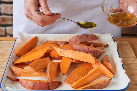 Den Ofen auf 200°C Umluft vorheizen. Die Süßkartoffel in ca. 1-2cm dicke Spalten schneiden. Die Süßkartoffel auf einem mit Backpapier belegtem Backblech mit 1-2EL Olivenöl, Salz, Pfeffer und 3/4 der Gewürzmischung würzen, gut vermengen und für ca. 20-25Min. im Ofen goldbraun backen.