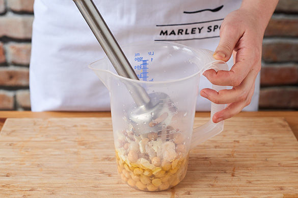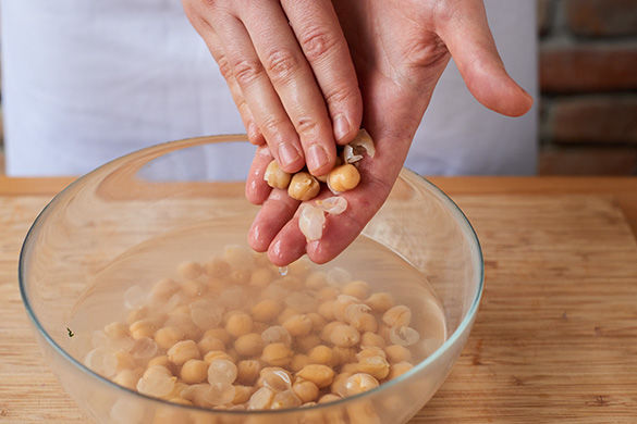 Kichererbsen durch ein Sieb abgießen. Tipp: Kichererbsen in eine Schüssel mit kaltem Wasser geben und mit beiden Händen aneinander reiben, sodass sich die äußere weiße Haut löst, die Kichererbsen aber nicht zerbrechen. Die Schalen abschöpfen und die Kichererbsen abtropfen lassen. So erhält man ein cremigeres Hummus.