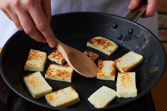 Inzwischen den Paneer in ca. 0,5cm dicke Scheiben schneiden.