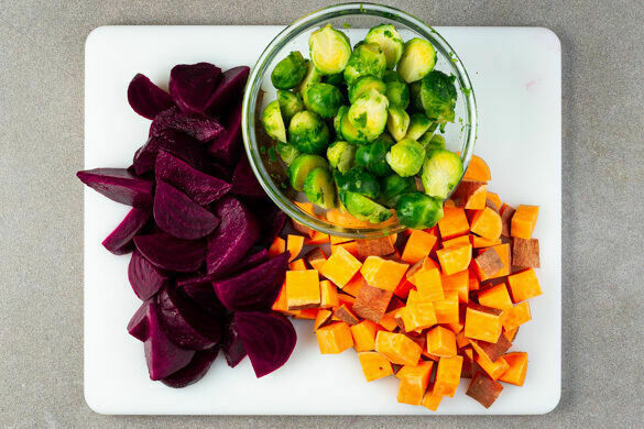 Den Backofen auf 240°C (220°C Umluft) vorheizen. Die Süßkartoffeln samt Schale in 1–2cm große Würfel schneiden. Den Rosenkohl halbieren. Die Rote Bete in ein Sieb abgießen und abtropfen lassen, dann halbieren und in ca. 2cm dicke Spalten schneiden. Tipp: Da Rote Bete stark färbt, beim Verarbeiten am besten Küchenhandschuhe und Schürze tragen.