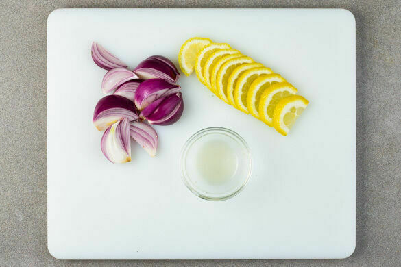 Die Zwiebeln schälen, halbieren und in 1–2cm dicke Spalten schneiden. Eine Zitrone längs halbieren und in feine Scheiben schneiden, die andere Zitrone halbieren und auspressen.