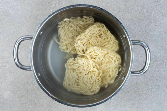Die Nudeln in das kochende Wasser geben und in 3–5Min. bissfest kochen. In ein Sieb abgießen und abtropfen lassen, dann zurück in den Topf geben und mit dem Sesamöl vermengen.