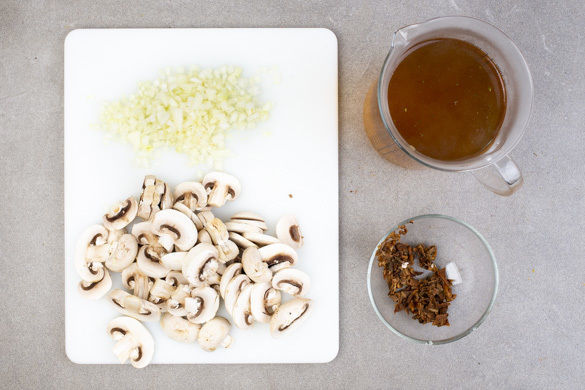 Das Brühgewürz in 1,5L heißem Wasser auflösen. Die Pilze ggf. mit etwas Küchenkrepp oder einer Bürste säubern. Die Stiele in kleine Stücke schneiden und ca. 5Min. in der Brühe einweichen. Die restlichen Pilze in feine Scheiben schneiden. Die Zwiebel schälen, halbieren und in feine Würfel schneiden.