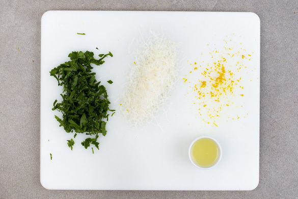 Die Petersilie samt Stängeln fein hacken. Den Käse fein reiben. Die Zitronenschale abreiben, dann die Zitrone halbieren und auspressen.