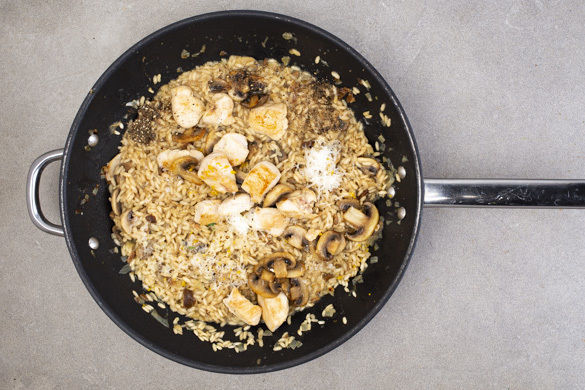 Die Zwiebeln und die restlichen Pilze in einer großen Pfanne mit 1–2EL Olivenöl bei mittlerer Hitze 2–3Min. anbraten. Den Reis und 1 Prise Salz dazugeben und 1Min. glasig mitbraten, dann etwa 200ml Pilzbrühe angießen und rühren, bis der Reis die Brühe aufgesogen hat. So fortfahren, bis die Brühe aufgebraucht und das Risotto sämig ist. Das dauert etwa 20Min.