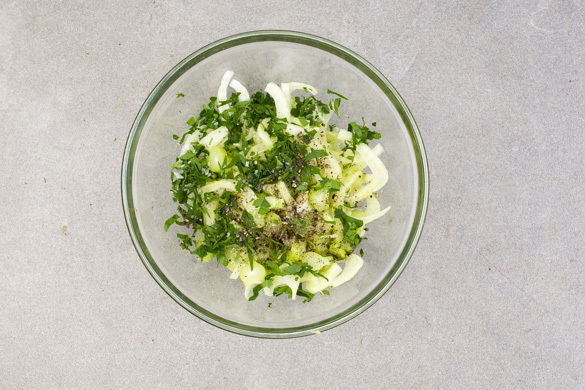Den Fenchel längs halbieren und in dünne Streifen schneiden, dabei den harten Strunk entfernen. Den Fenchel mit der 1/2 der Petersilie, 1–2EL Zitronensaft und 1–2EL Olivenöl vermengen und den Salat mit Salz und Pfeffer abschmecken.