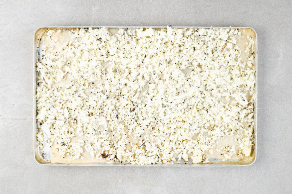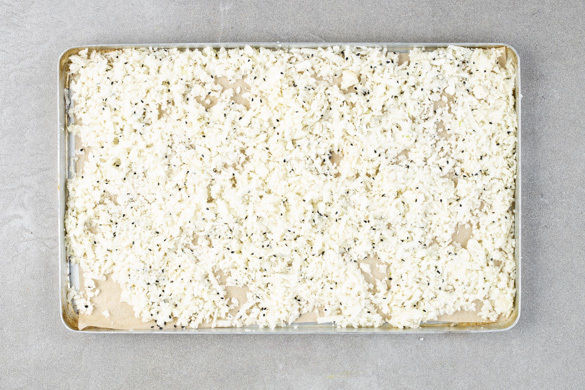 Den Blumenkohl mit einer Küchenreibe grob raspeln und auf einem mit Backpapier ausgelegten Backblech verteilen. Mit 1–2EL Pflanzenöl, dem Sesam sowie Salz und Pfeffer vermengen und ca. 8Min. im Ofen backen, bis der Blumenkohlreis gar und an den Rändern leicht gebräunt ist.
