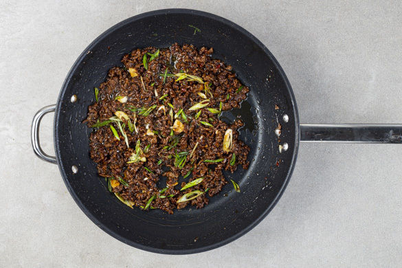 Das Hackfleisch in einer großen Pfanne mit 2EL Pflanzenöl bei starker Hitze 4–5Min. krümelig anbraten. Die 1/2 des Ingwers oder mehr, den Knoblauch, die Hoisinsauce, die 1/2 der Fischsauce und die 1/2 des Sambal Oelek unterrühren und vom Herd nehmen. Die 1/2 der Lauchzwiebeln unterheben. Ggf. mit mehr Fischsauce und Sambal Oelek sowie Salz nachwürzen.