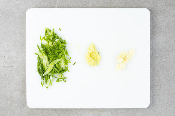 Den Backofen auf 200°C Umluft (220°C Ober-/Unterhitze) vorheizen. Die Lauchzwiebeln schräg in feine Ringe schneiden. Den Ingwer schälen und fein reiben. Den Knoblauch schälen und in feine Scheibchen schneiden.