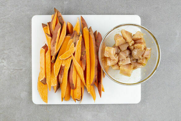 Den Backofen auf 240°C (220°C Umluft) vorheizen. Die Süßkartoffeln samt Schale in pommesartige Stifte schneiden. Den Knoblauch schälen, fein würfeln und mit 2EL Pflanzenöl, der Gewürzmischung und 1–1½TL Salz verrühren. Das Fleisch trocken tupfen und mit ⅓ des Würzöls vermengen.
