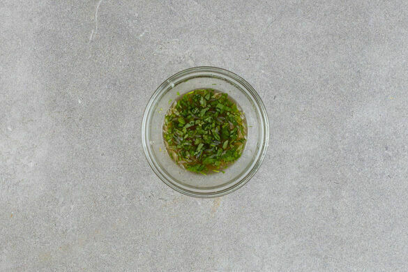 Den Limettensaft mit 1EL Fischsauce, 2EL der Kräuter, 1EL Wasser, 1TL Salz und 2TL Zucker verrühren. Das Dressing nach Geschmack mit mehr Fischsauce und ggf. Essig würzen.