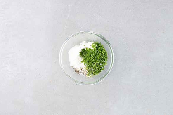 Den Schnittlauch in feine Röllchen schneiden und mit dem Frischkäse und ggf. etwas Wasser zu einem cremigen Dip verrühren. Mit Salz und Pfeffer abschmecken.