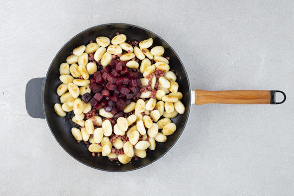 Die Gnocchi mit den Rote-Bete-Würfeln und dem Speck mischen, mit einem Klecks Frischkäse-Schnittlauch-Dip anrichten und mit dem Salat servieren.