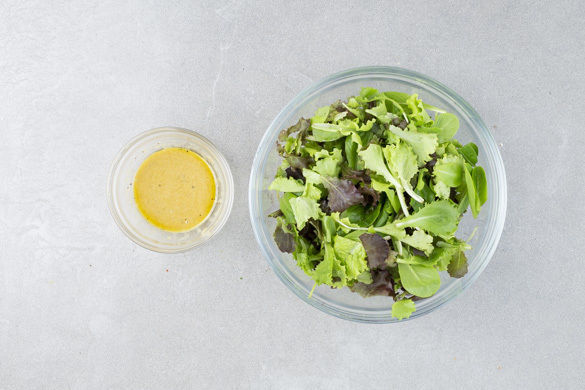 Aus 1–2EL Olivenöl, 1–2EL Essig, dem Senf sowie etwas Salz und Pfeffer ein Dressing anrühren und mit dem Salat vermengen.