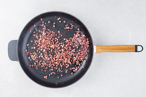 Währenddessen die Speckwürfel in einer großen Pfanne bei mittlerer Hitze 2–3Min. knusprig braten. Aus der Pfanne nehmen und beiseitestellen.