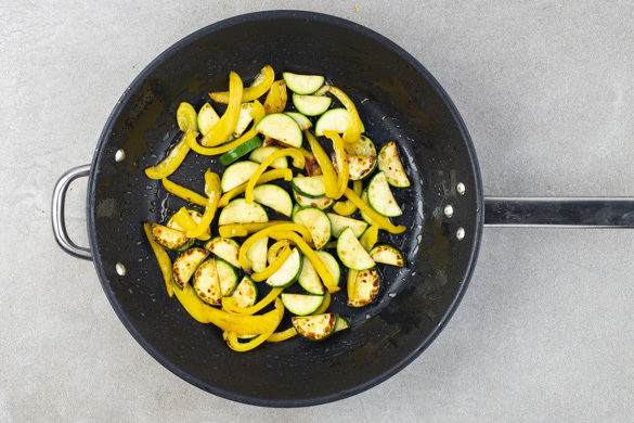 Die Zucchini und die Paprika in einer großen Pfanne mit 1–2EL Pflanzenöl bei starker Hitze 3–5Min. scharf anbraten. Das Gemüse auf einem Teller beiseitestellen.