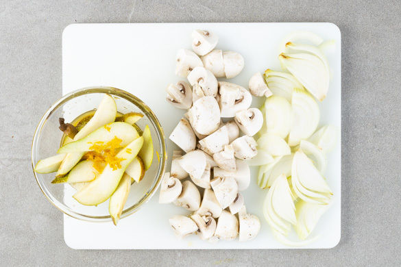 Die Birne vierteln, vom Kerngehäuse befreien und der Länge nach in ca. 0,5cm breite Spalten schneiden. Mit dem Orangensaft und 1TL -abrieb vermengen und beiseitestellen. Die Pilze ggf. mit etwas Küchenkrepp oder einer Bürste säubern und vierteln. Die Zwiebel schälen, halbieren und in ca. 0,5cm breite Streifen schneiden.