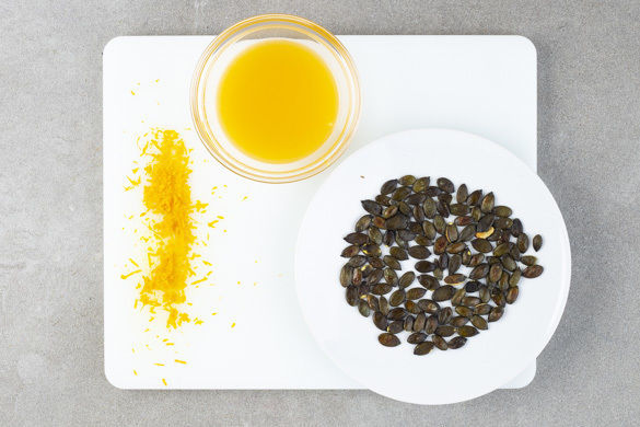 Den Backofen auf 180°C Umluft (200°C Ober-/Unterhitze) vorheizen. Die Orangenschale abreiben, dann die Orange halbieren und auspressen. Die Kürbiskerne in einer großen Pfanne ohne Zugabe von Fett bei mittlerer Hitze 2–3Min. anrösten. Auf einem Teller beiseitestellen, die Pfanne aufbewahren.