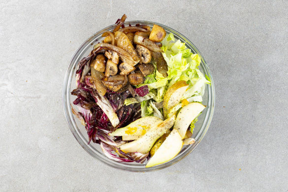 Die Birnen aus dem Orangensaft nehmen und mit dem Radicchio, dem Romanasalat und der Zwiebel-Pilz-Pfanne vermengen. Den Salat mit dem Orangensaft, dem restlichen Orangenabrieb sowie Salz und Pfeffer abschmecken. Die Schweinesteaks auf dem Salat anrichten und mit den Kürbiskernen garniert servieren.