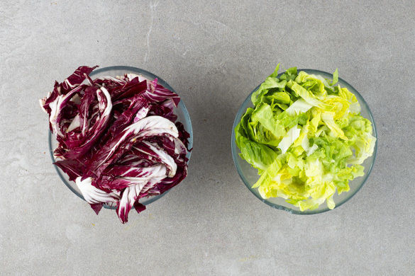 Den Radicchio und den Romanasalat in mundgerechte Stücke zupfen oder schneiden, dabei harte Strunkteile entfernen.