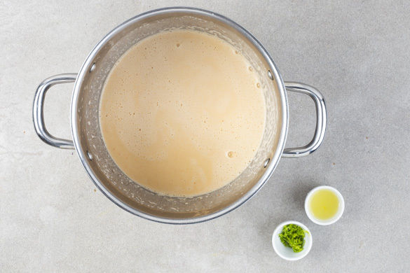 In einem zweiten mittelgroßen Topf die 1/2 des Brühgewürzes mit 100ml Wasser aufkochen lassen. Die Kokosmilch unterrühren und mit 1–2TL Currypaste sowie Salz abschmecken. Vorsicht, die Currypaste ist scharf! Besser zunächst etwas weniger nehmen und später nachwürzen. Die Limettenschale abreiben, dann die Limette halbieren und auspressen.