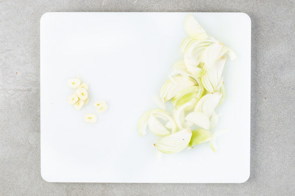 In einem mittelgroßen Topf ausreichend gesalzenes Wasser für die Nudeln zum Kochen bringen. Die Zwiebel schälen, halbieren und in feine Streifen schneiden. Den Knoblauch schälen und in feine Scheibchen schneiden.
