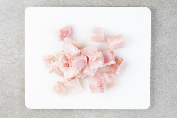 Den Fisch mit kaltem Wasser abspülen, mit etwas Küchenkrepp trocken tupfen und in ca. 2cm große Stücke schneiden, dabei evtl. vorhandene Gräten mit einer Pinzette entfernen.