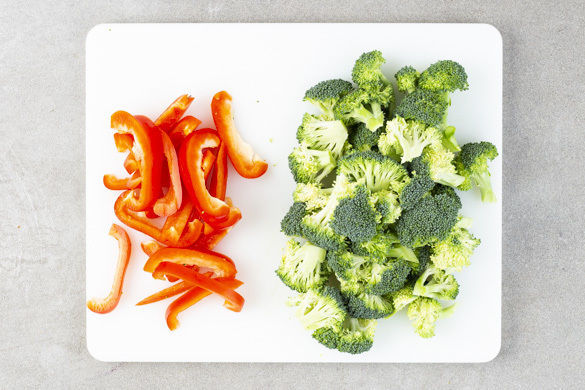 Die Paprika vierteln, entkernen und in 0,5–1cm breite Streifen schneiden. Den Brokkoli in ca. 2cm große Stücke schneiden.