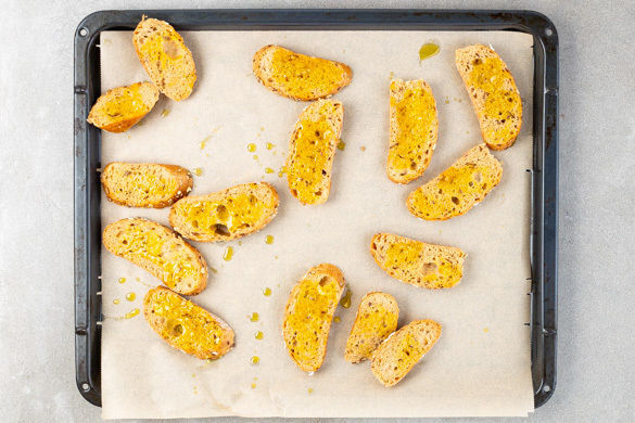 Die Crostini auf ein mit Backpapier ausgelegtes Backblech geben und unter dem Gemüse ca. 8Min. im Ofen goldbraun rösten.