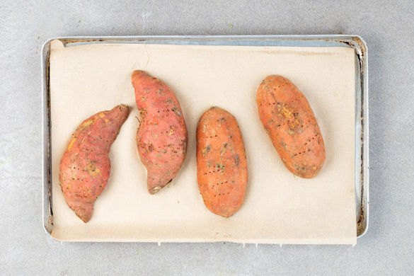 Den Backofen auf 220°C Umluft (240°C Ober-/Unterhitze) vorheizen. Die Süßkartoffeln der Länge nach halbieren und die Hautseite mit einer Gabel ca. 1cm tief einstechen. Die Süßkartoffeln mit der Schnittfläche nach unten auf ein mit Backpapier belegtes Backblech geben und 15–20Min. im Ofen backen, bis die Süßkartoffeln schon leicht weich, aber nicht ganz durch sind.