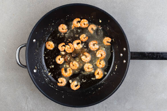 Das Zitronengras und den Knoblauch in einer großen Pfanne mit 1½EL Butter bei mittlerer bis starker Hitze unter Rühren ca. 2Min. braten, bis das Zitronengras weich wird. Die Garnelen hinzufügen und 1–2Min. mitbraten, bis sie pink und gar sind. Die Pfanne vom Herd nehmen, dann den restlichen Limettensaft und die restliche Fischsauce angießen.