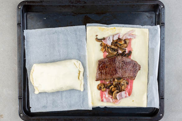 Den Teig mit dem Papier nach unten auf einem Backblech ausrollen und halbieren. Die Serranoscheiben überlappend auf die Teigstücke legen, Pilze und Fleisch daraufgeben. Den Teig quer über das Fleisch falten, sodass zwei kurze Päckchen entstehen, die Enden zusammendrücken. Mit 2EL Milch oder einem verquirlten Ei bestreichen und in 24–26Min. im Ofen goldgelb backen.