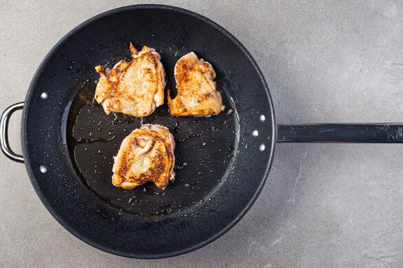Die Sauce in die Pfanne geben und mit dem Bratfett verrühren. Das Fleisch dazugeben und die Sauce unter gelegentlichem Rühren bei mittlerer bis niedriger Hitze 3–4Min. köcheln lassen, bis etwa die Hälfte der Flüssigkeit verdampft ist. Das Fleisch auf einem Teller beiseitestellen, die zurückbleibende Sauce unter den Salat mengen.