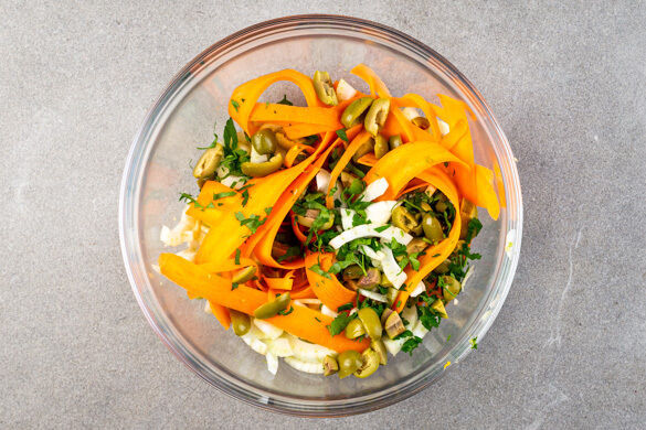 Die Petersilie samt Stängeln und die Oliven grob hacken. Die Karotte ggf. schälen und mit einem Sparschäler rundum in breite Streifen schneiden. Den Fenchel längs vierteln, den Strunk entfernen, das Fenchelgrün für die Garnitur beiseitelegen. Den Fenchel in feine Streifen schneiden und mit den Karotten, ¾ der Petersilie und ¾ der Oliven vermengen.