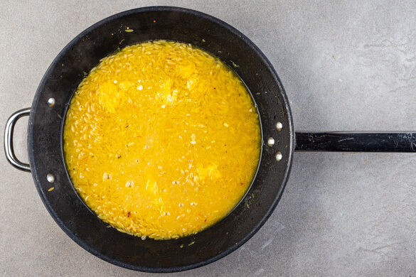 Die Pasta in der Pfanne unter ständigem Rühren ca. 1Min. glasig anschwitzen. Mit 400ml Wasser ablöschen, mit je 1 kräftigen Prise Salz und Pfeffer würzen und 12–14Min. köcheln lassen, bis die Pasta bissfest und die Flüssigkeit größtenteils verdampft ist. Vom Herd nehmen und etwas abkühlen lassen.